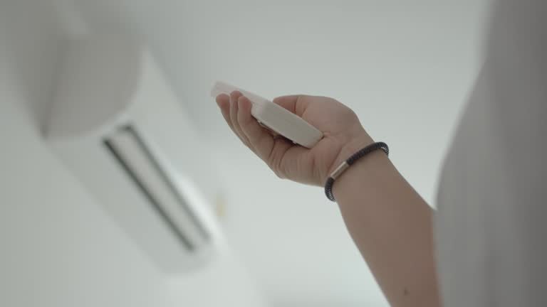 Human hand turns off the air conditioner from the remote control,Shift focus